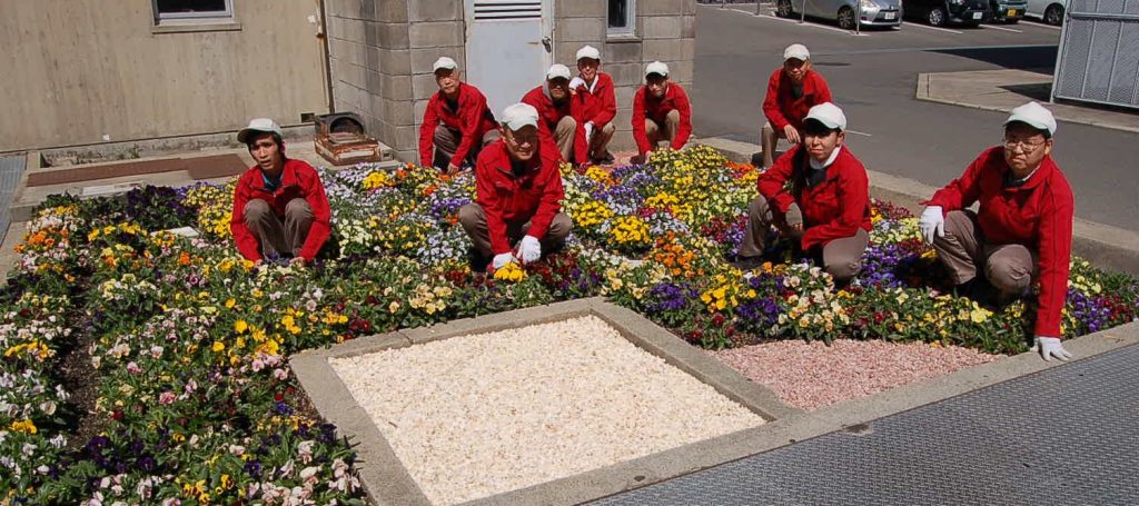 工学研究科内を「ピカピカにきれいにしよう」と働く愛称「工学ピカーズ」(総務課障がい者雇用推進支援室)です。障がいを持つメンバー7人が中心。このグループの生い立ちや活動全般は後日この欄できちんとまとめるとして、今回は花盛りになっている花壇についてご紹介します。